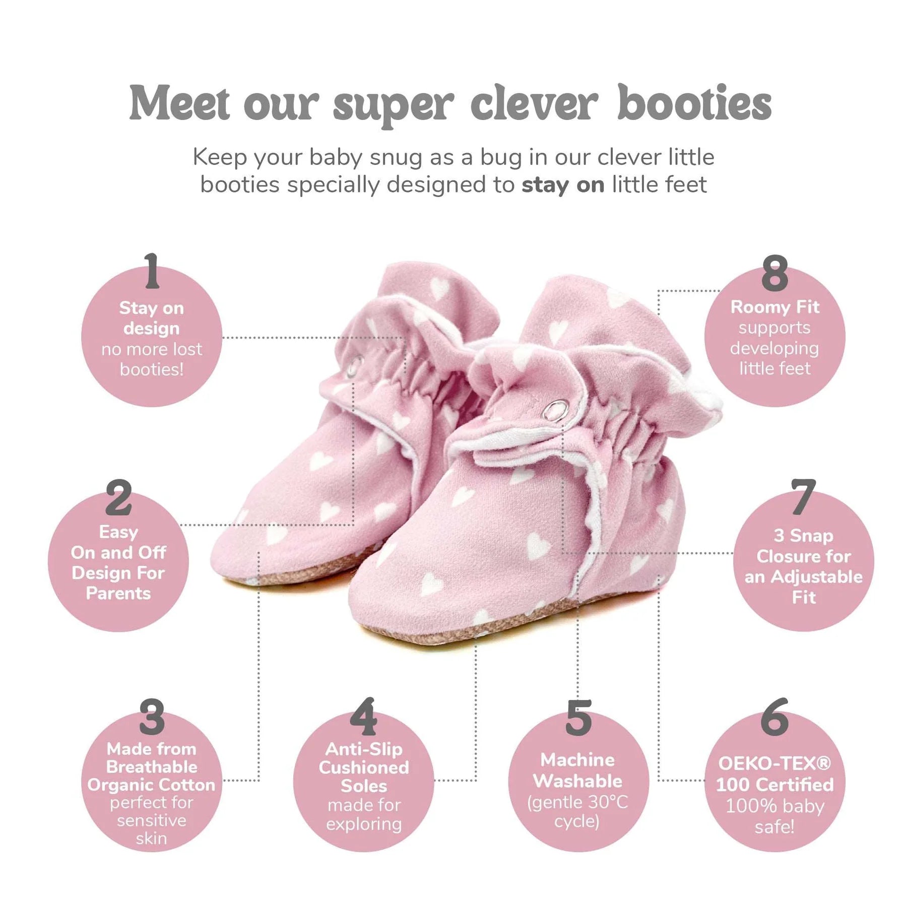 Keep your baby snug as a bug in our clever little cotton baby booties specially designed to stay on little feet. No more lost baby socks!